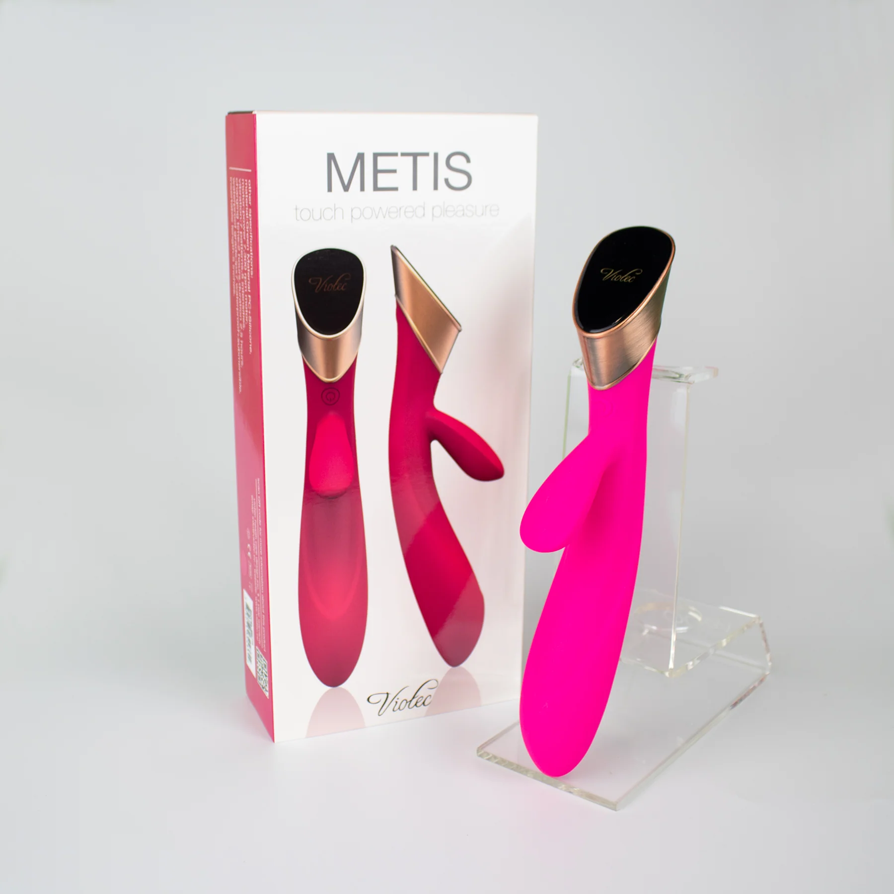 Mother of Athena and saboteur of the Titan Cronus, Metis was a beacon of wisdom and cunning. Her intelligent design assures simultaneous clitoral and G-spot massage operated by touch panel technology! Metis applies modern technology to a classic shape to produce an elegant and efficient rabbit vibrator. Soft, smooth silicone coats a flexible shaft and clitoral stimulator, each with their own powerful motor, and both curved to better target the clit and G-spot and rounded for widespread massage of each erogenous zone. Each motor simultaneously responds to upward or downward swipes across the touch panel base to increase or decrease intensity, as well as taps with the power button.They say knowledge is power. Metis packs plenty of both for a satisfying experience of dual stimulation!Adjust intensities by swiping up or down on touch panelIntensity also adjustable by buttonMedical-grade silicone body, ABS bezelUltra-strong motor produces 7 patterns at 5 intensitiesBoost button jumps to top speed immediatelyRechargeable, USB cord included1.5 hours of charge brings 2 hours of useIncludes discreet, durable storage box and cinch bagOverall length: 8.75 inchesWidth: 1.4 inchesInsertable length: 5 inchesStimulator dimensions: 2.4 inches long by 1.4 inches wide.Comes in Red, Wine Red, Pink, Fuchsia, BlueWhisper quietWaterproof1-year manufacturer’s warranty