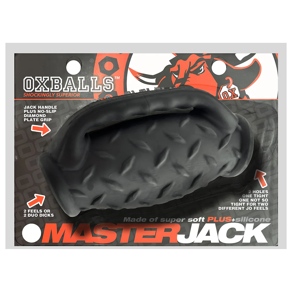 Heavy, fleshy MASTERJACK is for pro-level gooners, stroker that crave something thick with two hole they can fuck with hard. It's hefty, feels blubbery in your fist and packed with features that'll make your JO so much better than a basic handy.MASTERJACK has a handle so no matter how greasy sloppy and wet you bate, it stays in your fist. It's made of our softest silicone blend flubbery Plus+SILICONE with a dull suede finish and industrial diamond plate grips all over the outside.You can fuck it 2-ways: One end has a tighter butt-pucker hole with inner ribs and nubs to add feel to your shaft or flip it over and slide into the ringed sloppier hole a bigger gape for a smoother jack.Use any OXLUBE lubes–our lubes are ultra concentrated and designed for toying around, just a drop on your shaft and you can go balls-deep into MASTERJACK.MASTERJACK handle grip strokerDiamond plate grip surfaceExtra-soft Plus+SILICONE is fleshy warm2 holes: tighter butt-pucker or gaping holeHeavy, thick master-jackerDIMENSIONS:Length: 5.5 in./14cmWidth: 3 in./8cmDepth: 2 in./5cmCircumference: 7 in./18cmInside diameter: 1-2.5 in./3-6cmInner shaft length: 5 in./13cmProduct weight: 8 oz./227gPACKAGING DIMENSIONS:Height: 7.5 in./19cmWidth: 5.5 in./14cmDepth: 2.3 in./6cmWeight: 10 oz./284g